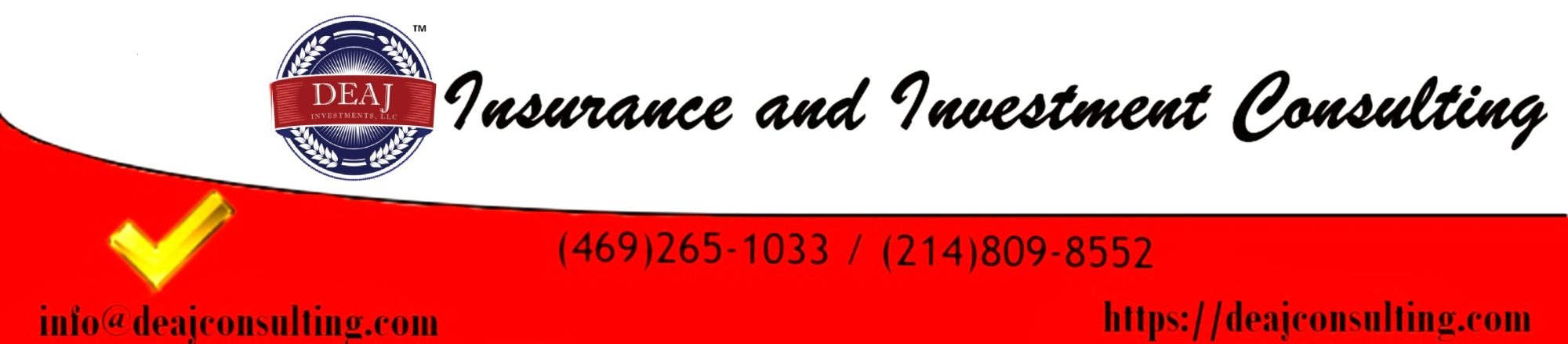 DEAJ Insurance and Investments Consulting is currently seeking approval as a Registered Investment Adviser (RIA) with Texas State Securities Board. The information on this website pertaining to any investment product(s) or investment advise are for informational purposes only and does not constitute an offer to sell or buy any security or investment advisory services. Investment advisory services can only be provided after the firm is registered and a written advisory agreement is executed.